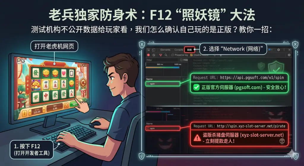 🕵️♂️ 老兵独家防身术:F12 “照妖镜”大法 测试机构不公开数据给玩家看,我们怎么确认自己玩的是正版?教你一招: 在电脑打开老虎机网页,按下键盘 F12(打开开发者工具),选择 “Network (网络)”。在游戏里按一下 Spin,看数据包连去哪个域名。如果你玩 PG Soft,数据必须连去 pgsoft.com 或官方伺服器;如果连去什么 xyz-slot-server.net,恭喜你,遇到盗版杀猪盘,立刻提款走人!